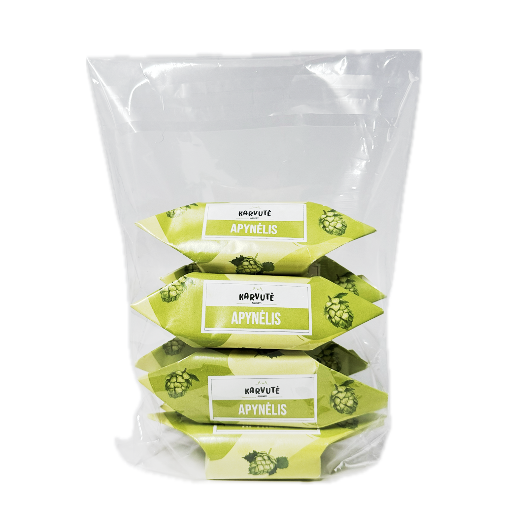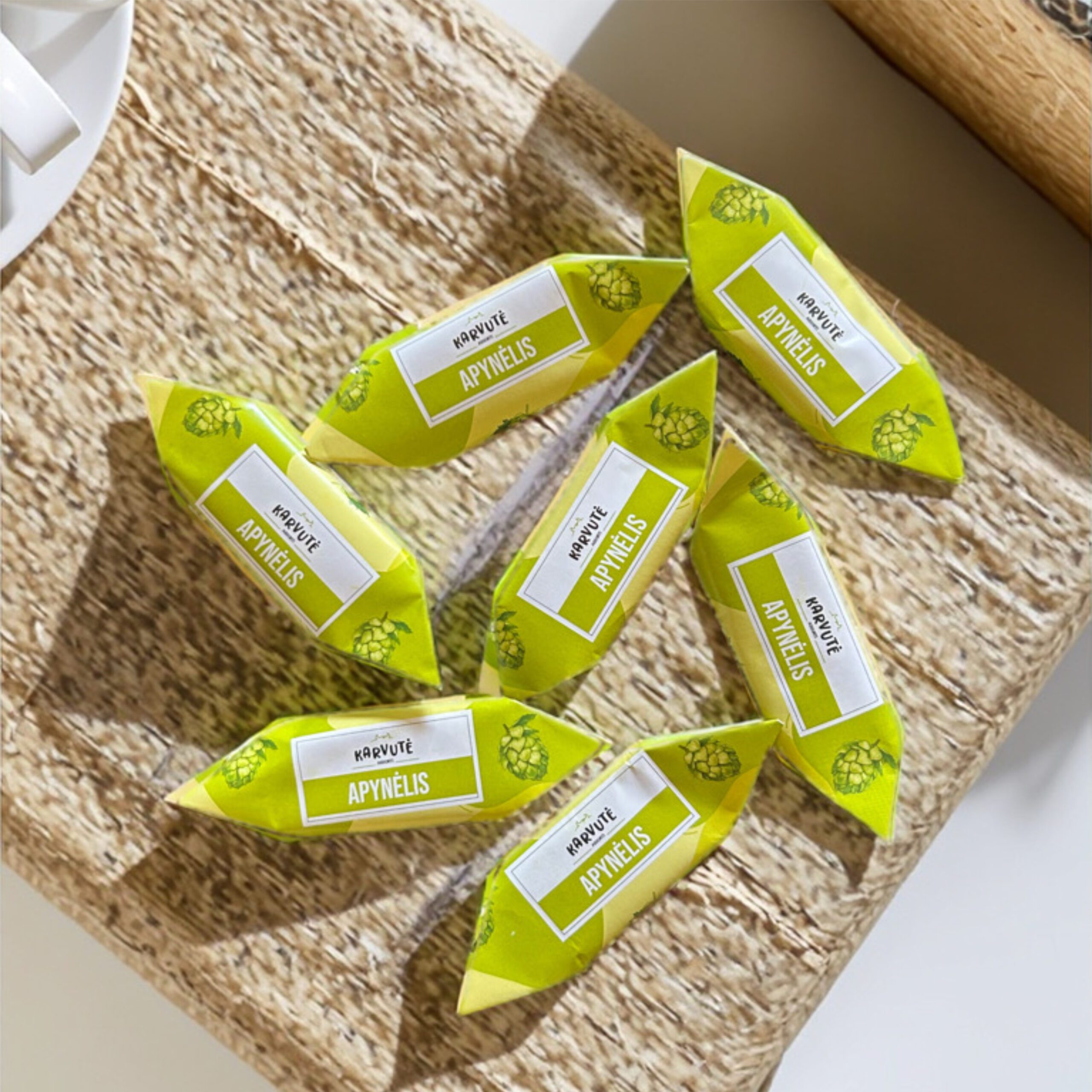 Rankų darbo karamelinis saldainis su apyniais – netikėtas ir subtilus skonio atradimas. Apyniai švelniai papildo saldžią karamelės tekstūrą, suteikdami malonų ir gaivų skonį. Tikri ingredientai, be palmių aliejaus, be pridėtinės druskos.