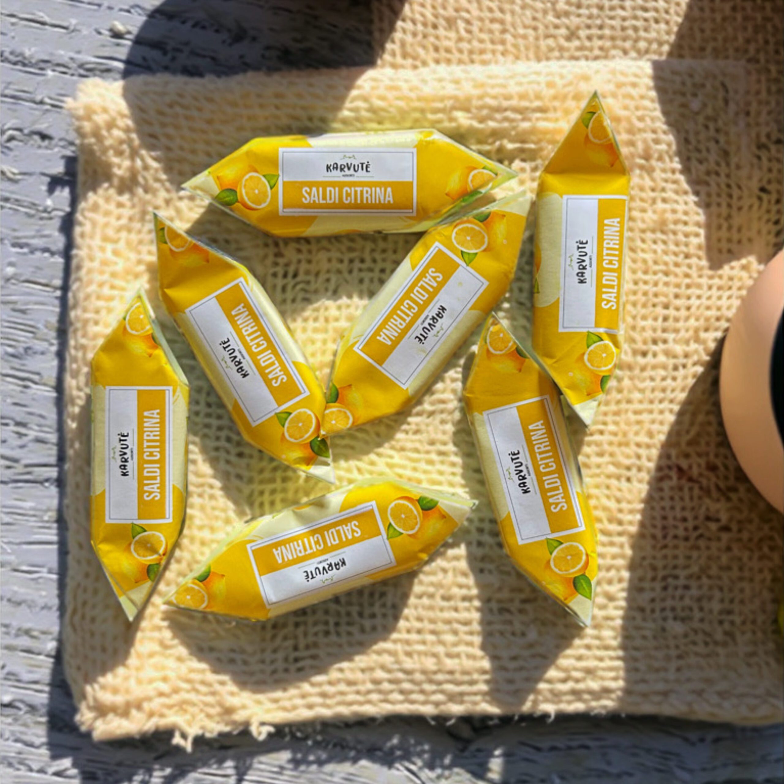 Rankų darbo karamelinis saldainis su natūralia citrina – gaivus ir švelniai rūgštus derinys.